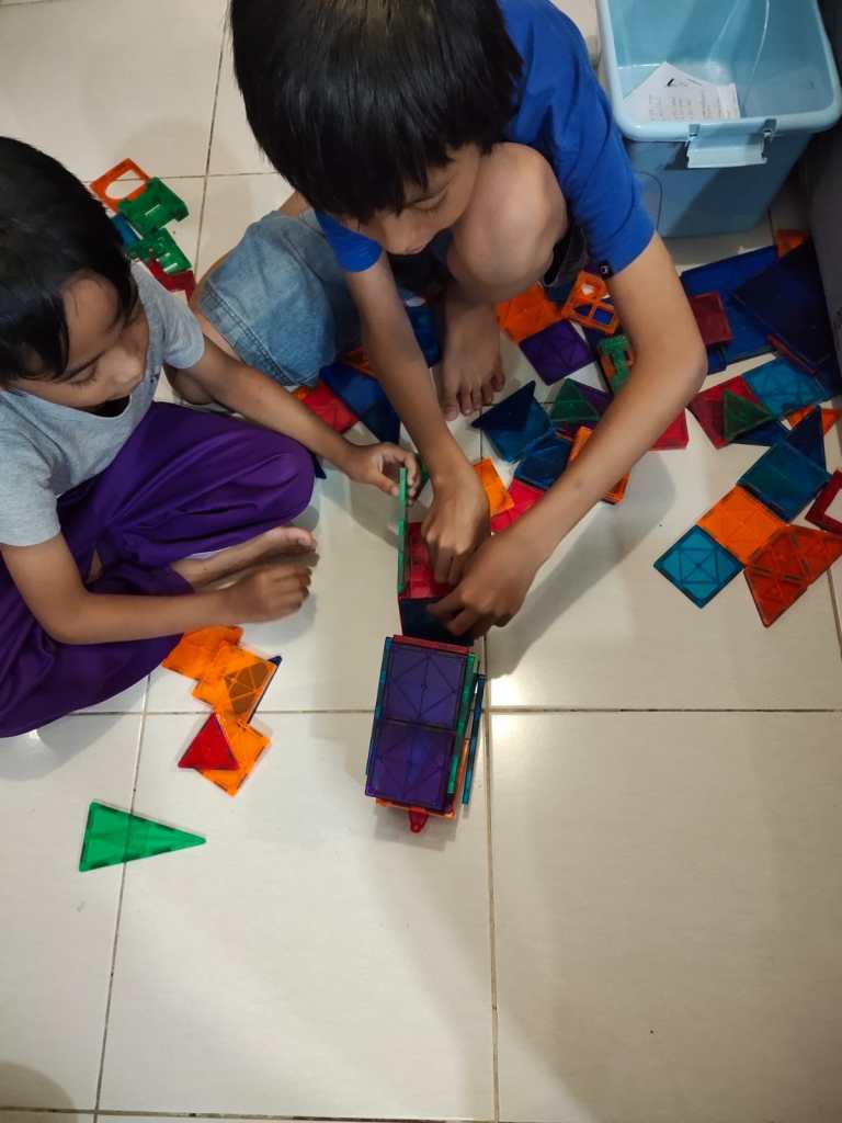 Kamipun langsung antusias tidak sabar mencobanya, setelah tidur siang selama 2 jam, saya dan adik langsung menagih janji mami saya karena harus mengikuti jadwal yang telah dibuat. Setelah membuka kotak tempat Magnetic Bricks tersebut, saya sempat bingung dengan buku manualnya untuk membuat apa yang akan dibuat.